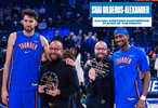 雷霆官方晒照:本场比赛前,亚历山大领取了12月份西部最佳球员奖杯,霍姆格伦领取了12月份西部最佳防守球员奖杯。