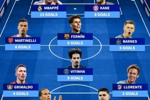 本赛季欧冠进球最多11人阵:姆巴佩、凯恩领衔锋线,马丁内利在列