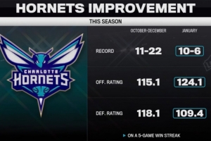1月:10胜6负,进攻效率124.1,防守效率109.4。