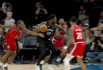比赛的第三节,兰德尔支肘开路打到邓恩下巴,后者表情痛苦并无大碍。