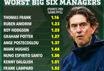 在所有执教英超比赛不少于10场的Big6主教练中,托马斯-弗兰克的场均积分和胜率均排名垫底,成为了历史上战绩最为糟糕的豪门教练。经历了波斯特科格鲁时代的波折之后,热刺依然没有恢复元气。