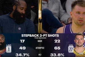 现场转播方晒出本赛季后撤步三分统计:哈登49投17中,命中率34.7%;东契奇65投22中,命中率33.8%。