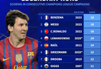 据德转(Transfermarkt)的统计,在连续赛季欧冠进球这一指标上,梅西和本泽马并列历史第一。