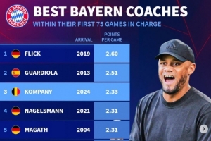 拜仁主帅前75场场均拿分榜:弗里克压瓜帅居首 孔帕尼2.33分列第3