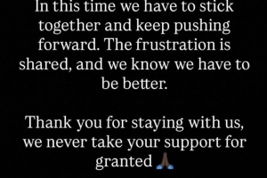 中场帕佩·萨尔在赛后通过社媒发文向球迷们致歉:“在这段时期,我们必须团结一致,继续前进。我们同样感到沮丧,并且深知我们必须做得更好。”
