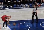 希罗执行技术罚球,准备做空手投篮动作时,被本场女裁判扔过来的篮球砸到了裆部。随后希罗弯腰缓了一会,裁判连忙过来表达了歉意。