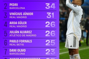 姆总领跑!西甲运动战创造机会排行:姆巴佩佩德里维尼修斯前三