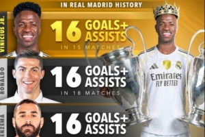皇马队史决赛参与进球榜:维尼修斯16球追平C罗并列榜首
