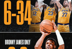 本场比赛垃圾时间布朗尼登场,打了1分53秒,三分2中2砍下6分。而本场比赛其余球员合计34投6中。