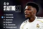 皇家马德里首发:1-库尔图瓦、17-劳尔-阿森西奥、18-阿尔瓦罗-卡雷拉斯、24-赫伊森、5-贝林厄姆、6-卡马文加、8-巴尔韦德、14-琼阿梅尼、7-维尼修斯、10-姆巴佩、16-贡萨洛-加西亚;