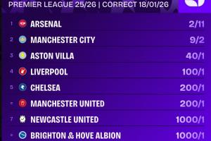 优势扩大!英超夺冠赔率:阿森纳超低赔率领跑 曼城第2 维拉第3
