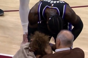 GIF-施罗德抢断界外球 意外肘到场边一位女性球迷的头部