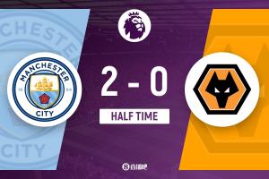 上半场伤停补时4分钟,半场结束,曼城暂2-0狼队。