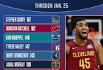 直播吧1月27日讯 NBC晒出了赛季至今的球员三分命中数排行榜。其中库里排名第一、米切尔第二、克尼佩尔第三。